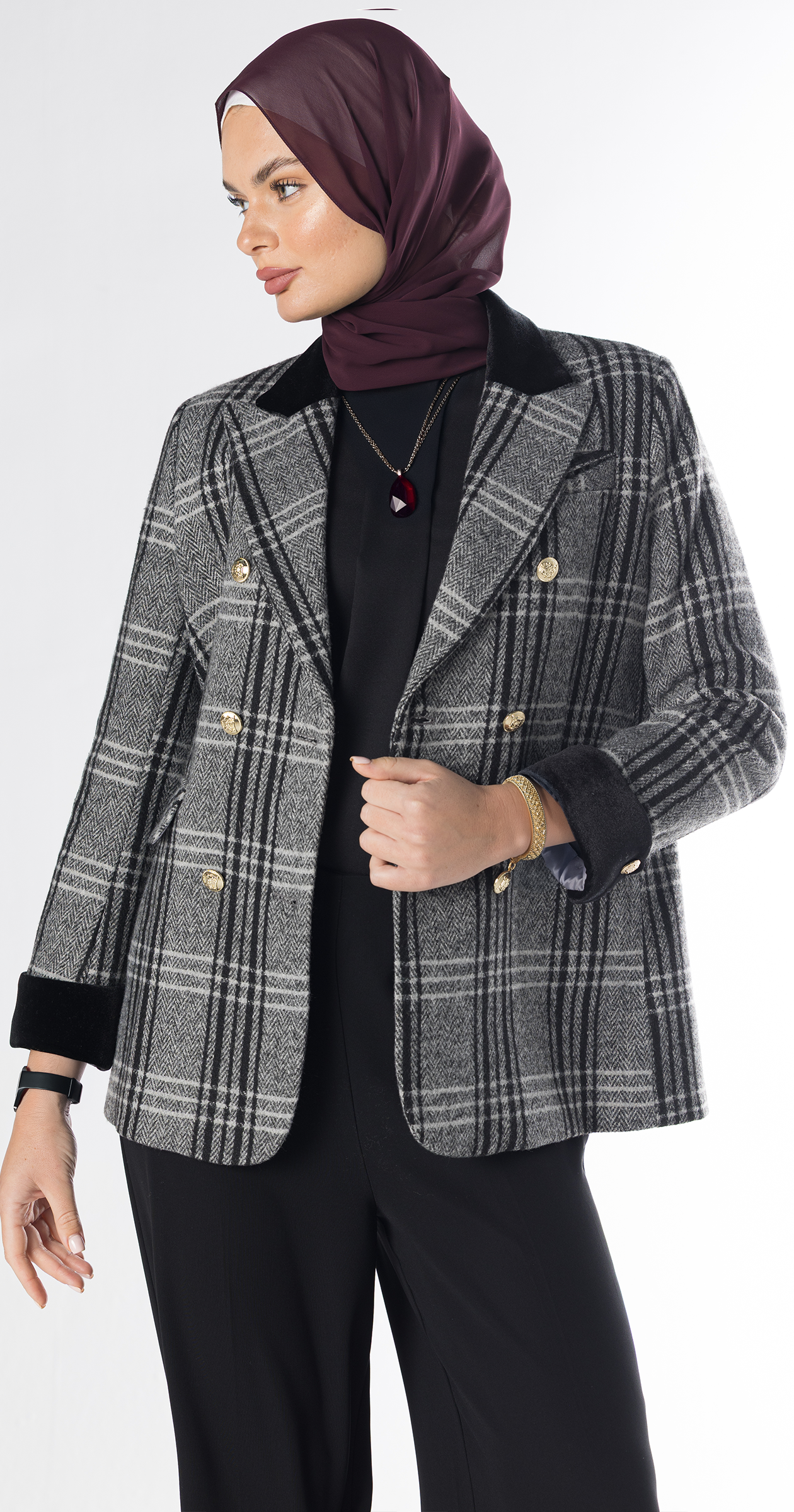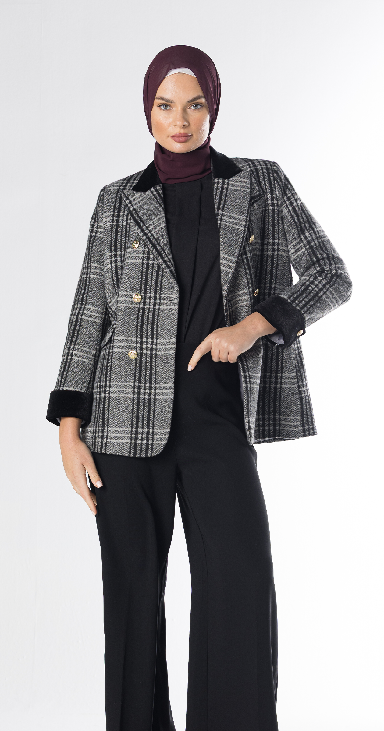 The blazer is elevated with black velvet accents on the collar and sleeve cuffs, adding a luxurious finish and a distinctive contrast to the plaid pattern. The cut is both sophisticated and versatile, perfect for pairing with tailored trousers for formal settings or dressing down with jeans for a chic casual vibe