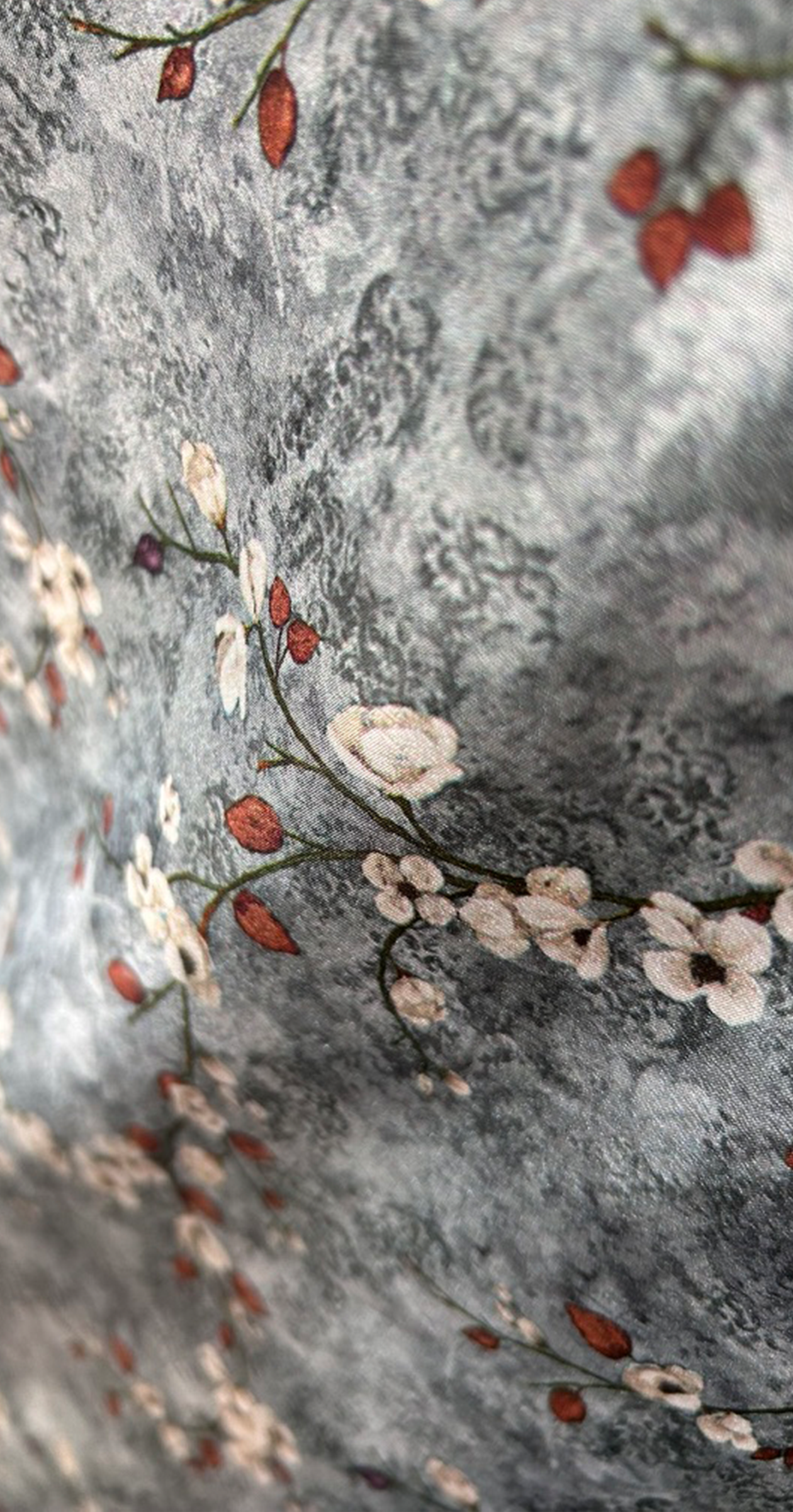 A high-waisted, Flare maxi skirt with a soft, flowing silhouette. The skirt features a muted grey base with an elegant, delicate floral print in white and subtle reddish-brown tones, giving it a refined and feminine look.