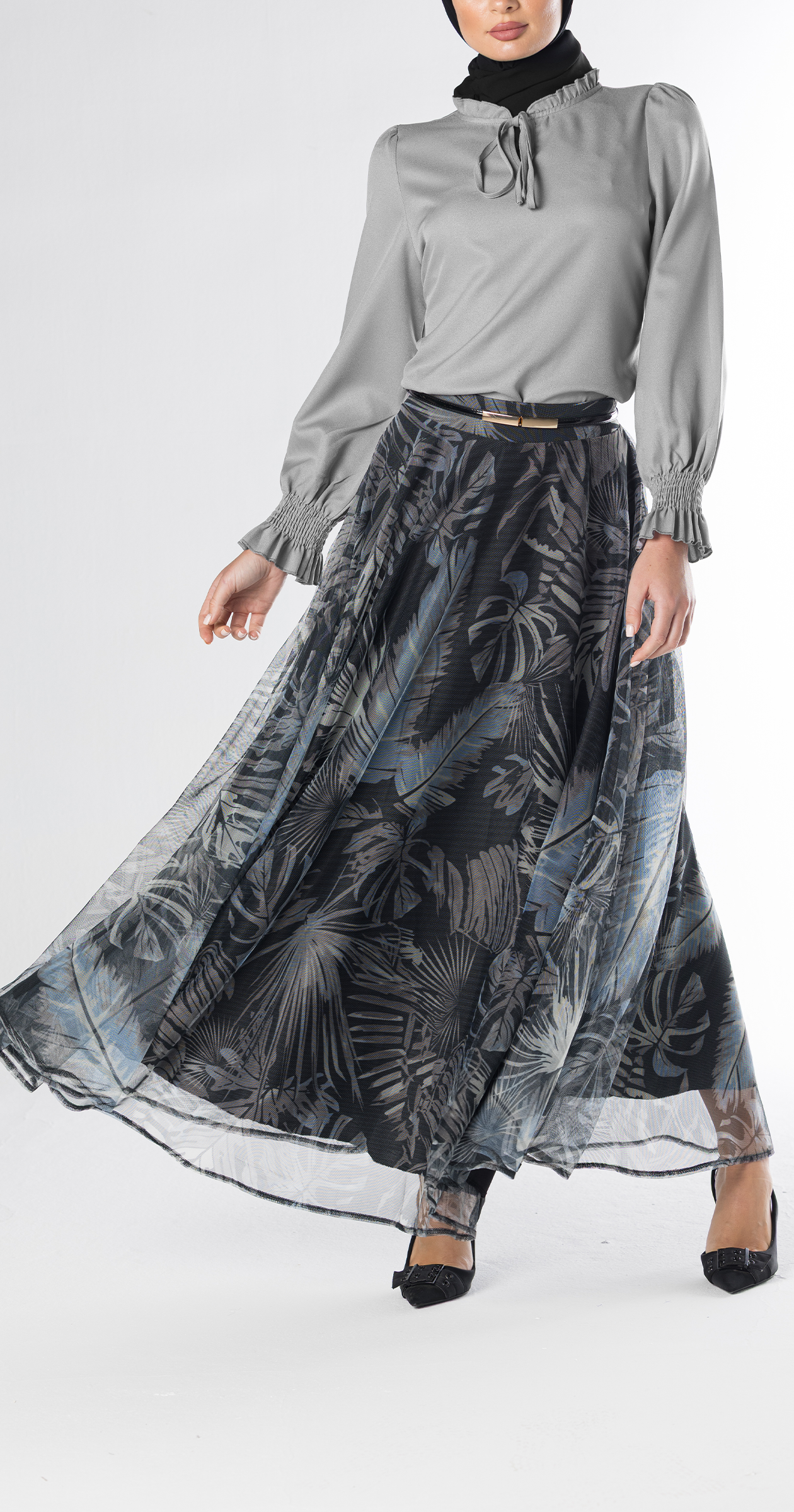 Flowy Circle maxi skirt crafted from lightweight sheer fabric with a soft lining underneath. The design features a layered, semi-transparent overlay adorned with a botanical leaf print in shades of black, grey, and subtle blue, giving it depth and movement. The skirt’s fullness creates a graceful, floating effect when in motion, making it both elegant and versatile.