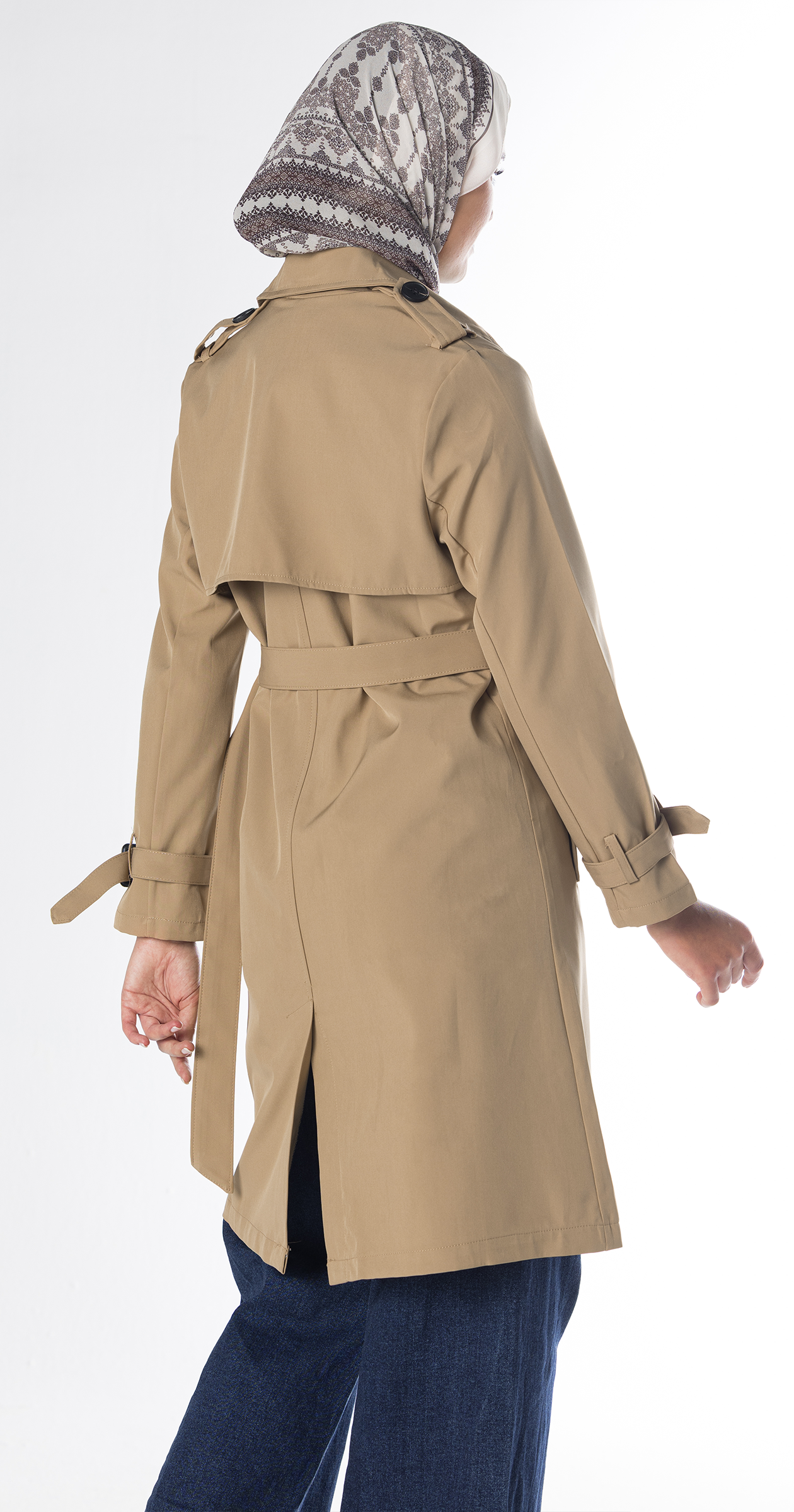 Epaulets on the shoulders enhance the classic trench coat's military-inspired touch.