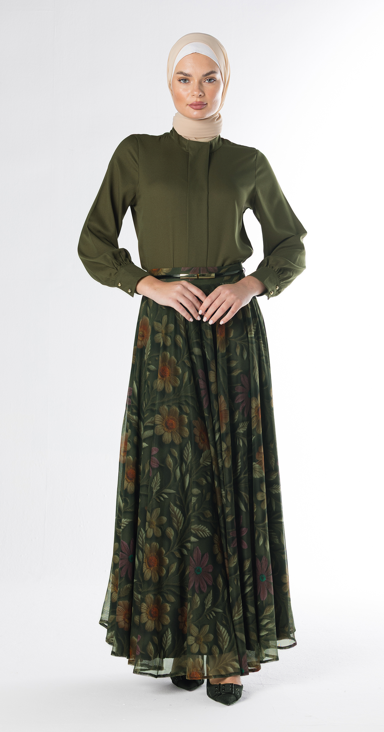 A flowing full-circle maxi skirt in a deep emerald green base, adorned with a delicate vintage floral print in earthy tones of rust, mauve, and golden beige. The skirt features a sheer overlay with soft lining underneath, creating both depth and movement. Designed with an elegant high waist, it’s finished with a slim black belt for added structure. The combination of rich colors and graceful drape makes it perfect for both daytime elegance and evening sophistication.