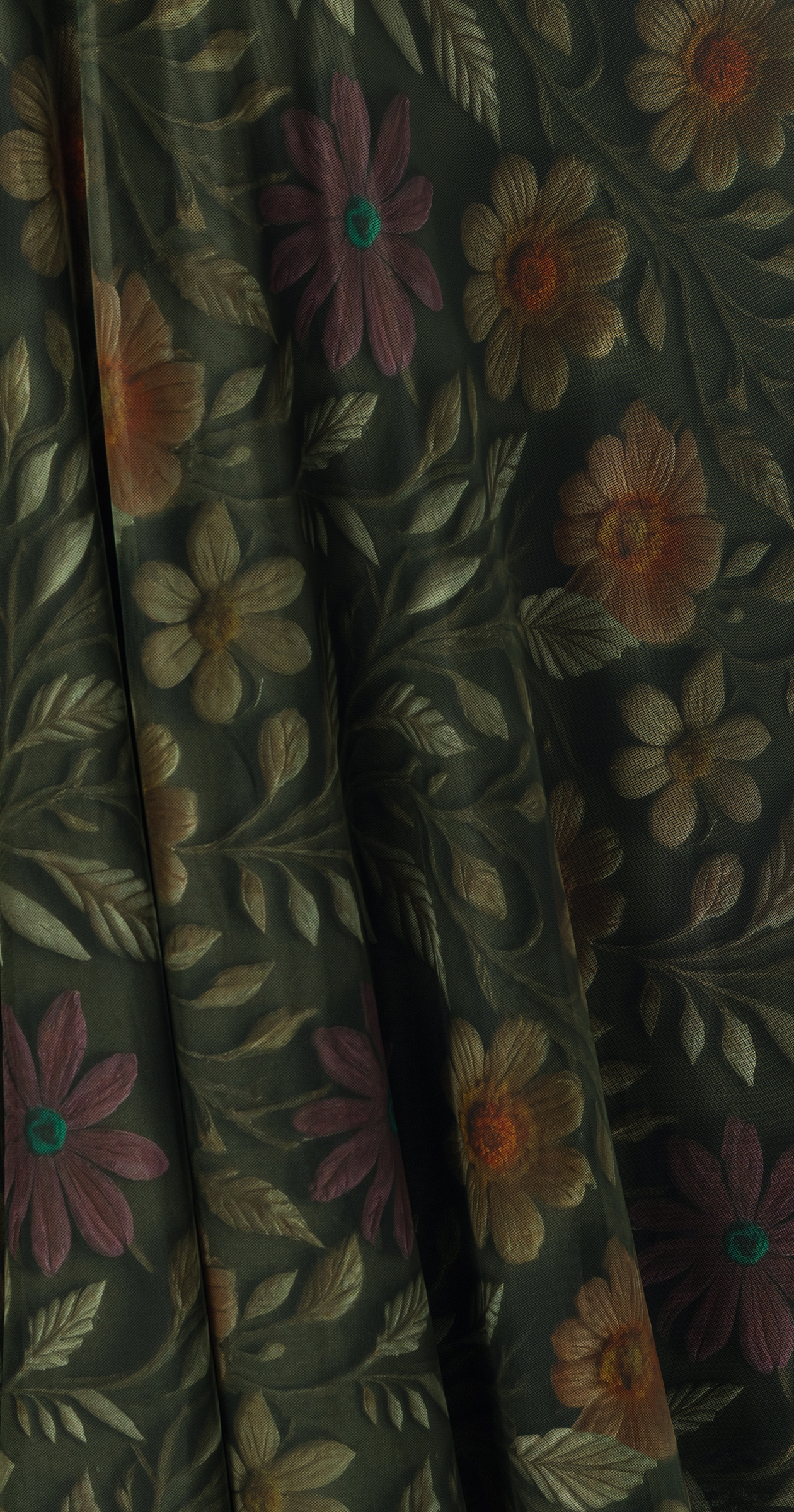 A high-waisted, flare skirt crafted in a rich, deep olive green base, featuring a beautifully detailed botanical floral print. The design showcases an artistic mix of warm, earthy tones—including burnt orange, soft pink, beige, and muted gold—creating a vintage-inspired yet refined look.
