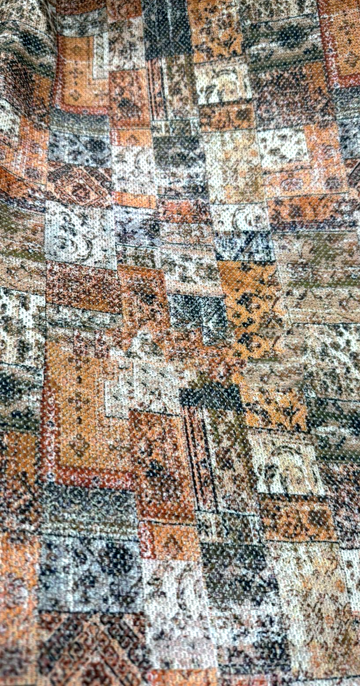 A long, straight-cut hoodie coat with warm earthy patchwork, front zipper, and soft comfortable fabric. The inner side features plush velvet for added warmth and elegance—perfect for modern, modest everyday wear.
