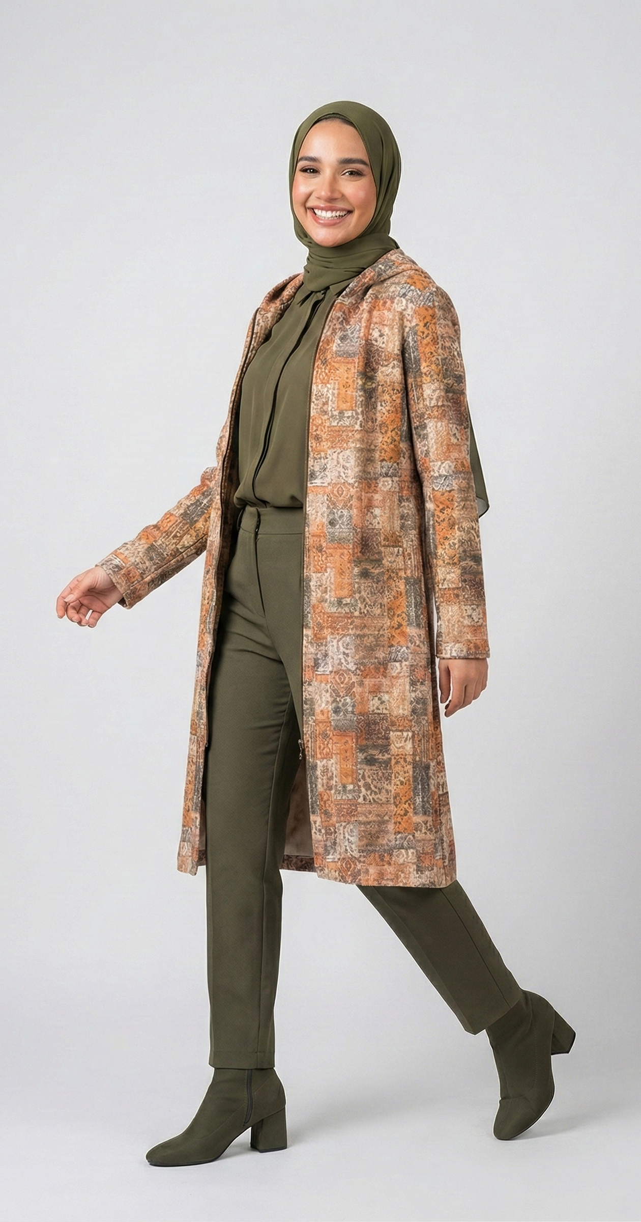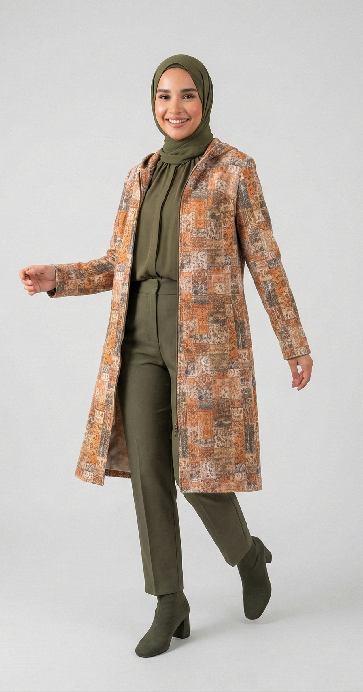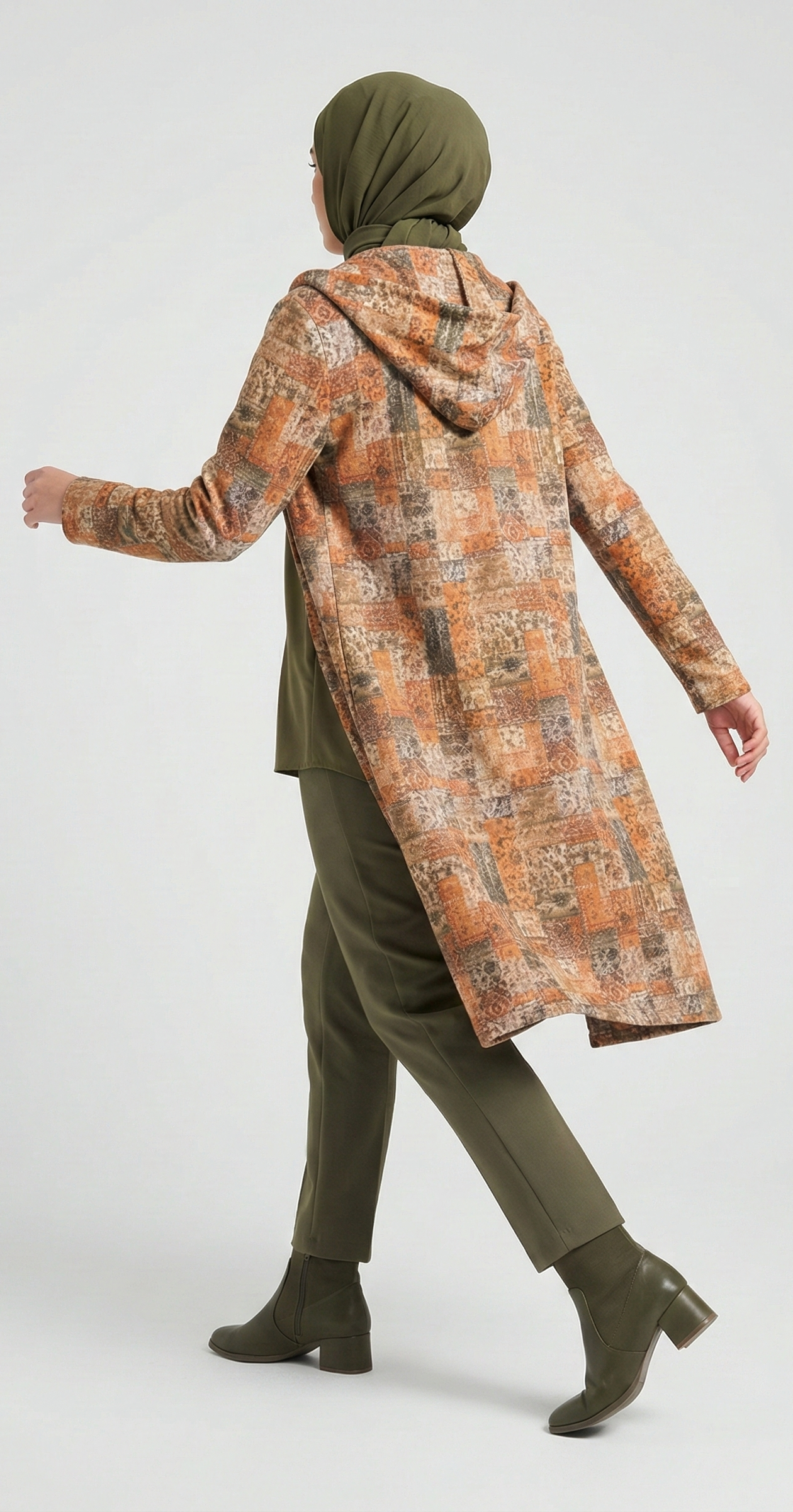 A long, straight-cut hoodie coat with warm earthy patchwork, front zipper, and soft comfortable fabric. The inner side features plush velvet for added warmth and elegance—perfect for modern, modest everyday wear.