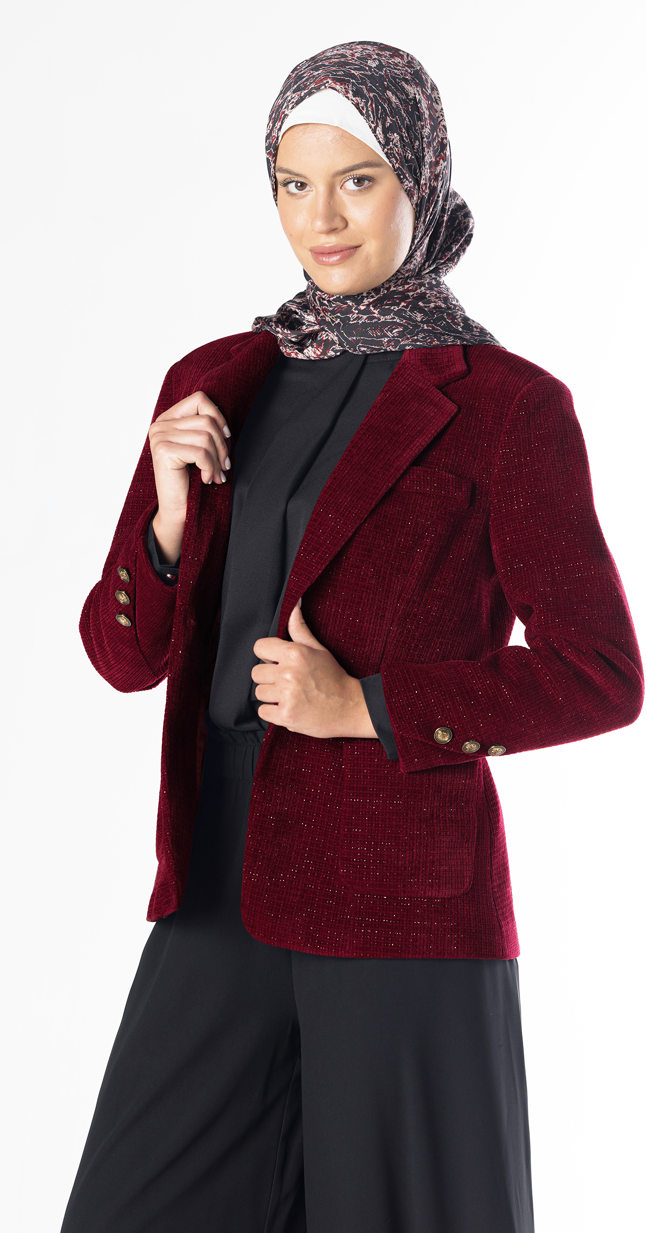 A deep burgundy & Black ribbed velvet blazer with a subtle sheen. Classic notch lapels, single-breasted front with one gold button, and triple gold cuff buttons. Lightly structured shoulders, welt chest pocket, and two roomy patch pockets at the hips. Hip-length, straight silhouette—easy to dress up with black trousers or down with denim.